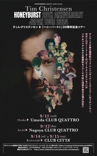 Dizzy Mizz Lizzy から Tim Christensen のソロ公演だよ。 x.com/sonymusic_loud/status/1833790075584631139 タイトル: Tim Christensen ”Honeyburst” 20th Anniversary Japan Tour MEMBER: On Vocal, Guitar:Tim Christensen On Guitar:Lars Skjærbæk …
