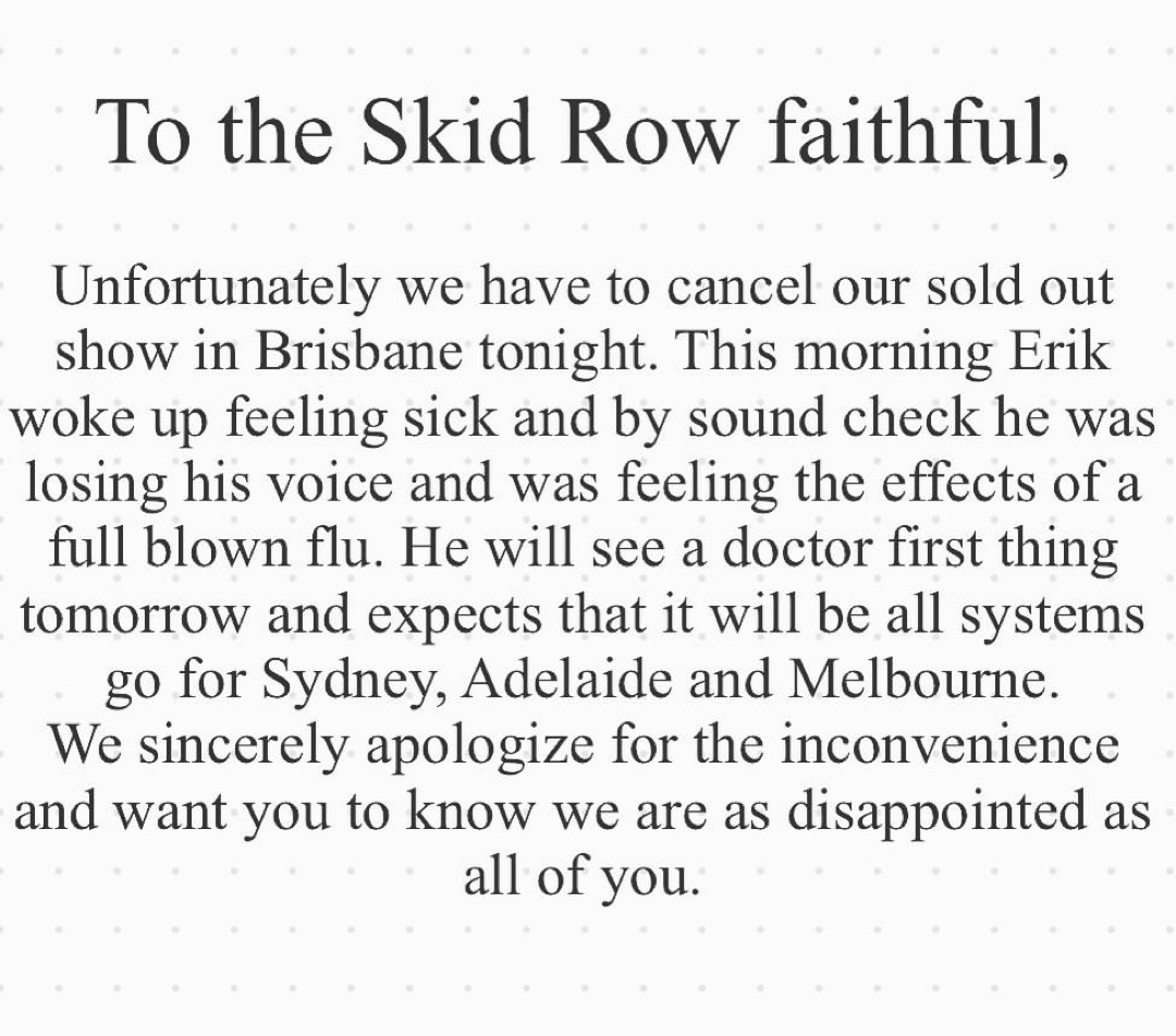 「ブリスベン公演をキャンセルする。Erik の体調が悪く、サウンドチェックのとき、遂に声がでなくなってしまった。インフルエンザだと思われるので、すぐ医者に診てもらう。迷惑をかけて申し訳ない。」