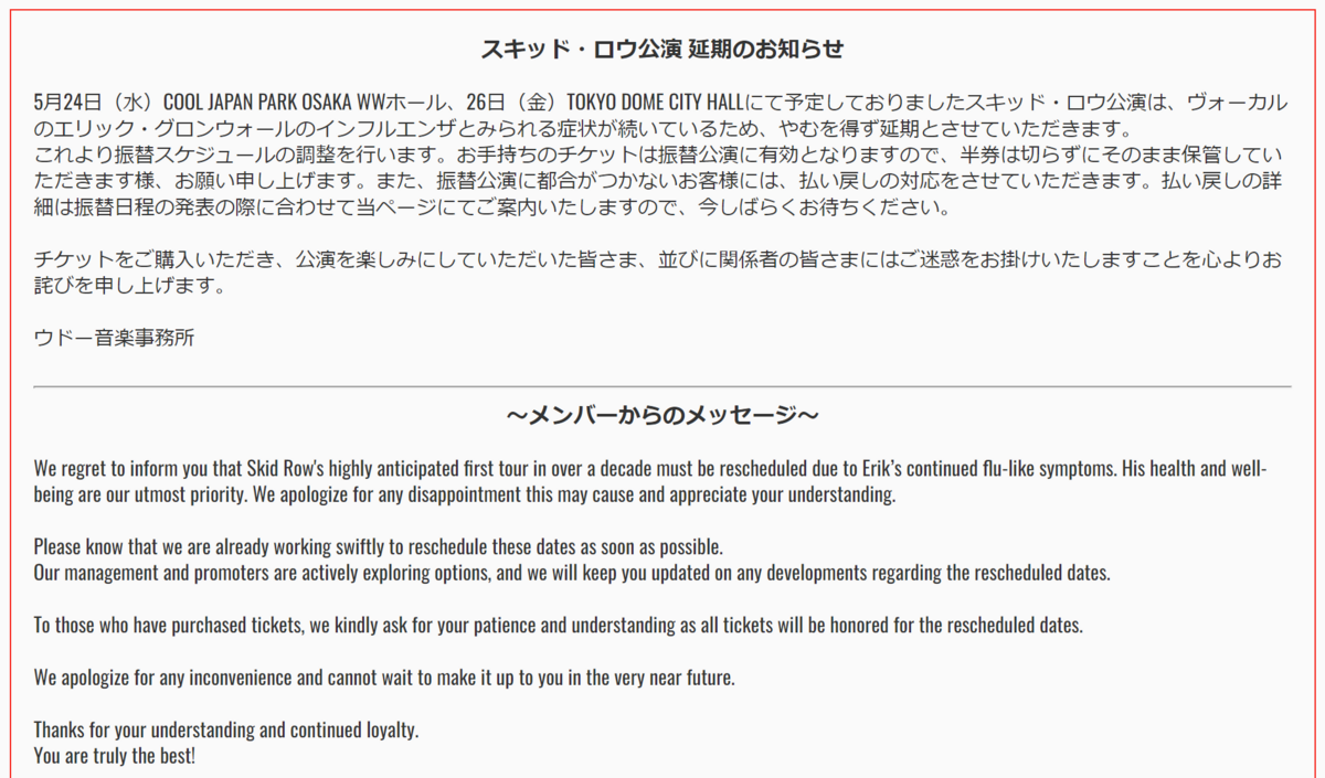 Skid Row 来日公演の延期が発表されました。