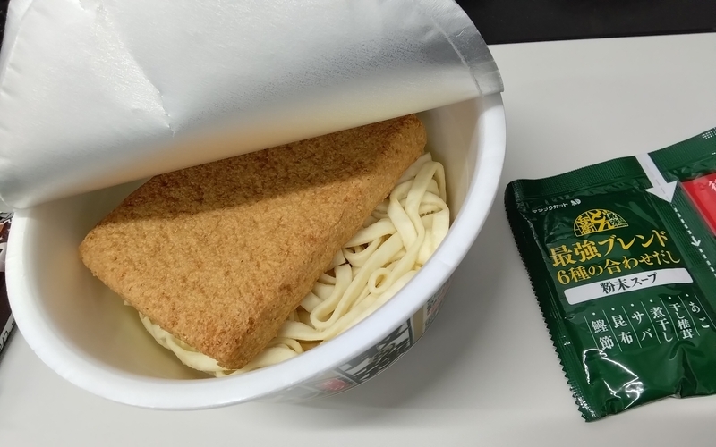 麺が太く、お揚げも1.5倍くらいのサイズになっているせいか、お湯を注いで 8分待ち。